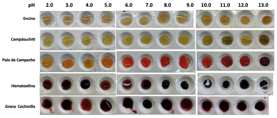 Como parte del componente experimental de la secuencia didáctica, se llevó a cabo una experiencia práctica de observación del comportamiento de diversos tintes naturales —como encino, cempasúchil, palo de Campeche, hematoxilina y grana cochinilla— frente a distintas condiciones de pH. Se aplicaron gotas de cada tinte sobre placas de porcelana, añadiéndoseles soluciones con valores de pH que iban del 2.0 al 13.0, registrándose los cambios cromáticos observados (Figura 5). Esta actividad permitió al estudiantado interpretar el comportamiento ácido-base de los grupos funcionales presentes en los tintes, vinculando el fenómeno del viraje de color con las propiedades químicas del entorno. Esta actividad integró contenidos clave de la química, como las propiedades ácido-base, con el análisis del patrimonio cultural, reforzando la comprensión de conceptos científicos en un contexto experimental, auténtico y significativo.