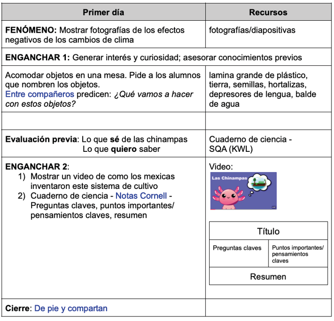 Para el primer día se mostraron, a través de diversas imágenes, los efectos del cambio climático. Como contexto para los estudiantes, ellos recién habían vivido los incendios de diversos condados en la región, y muchos profesores habían sido afectados. Por ello, se consideró vincularlo con las vivencias de su contexto, con la finalidad de enganchar. Así, se retomaron conocimientos propios y los estudiantes mostraron interés. De igual manera, se presentaron recursos videográficos para la comprensión e importancia de alternativas de siembra y cosecha.