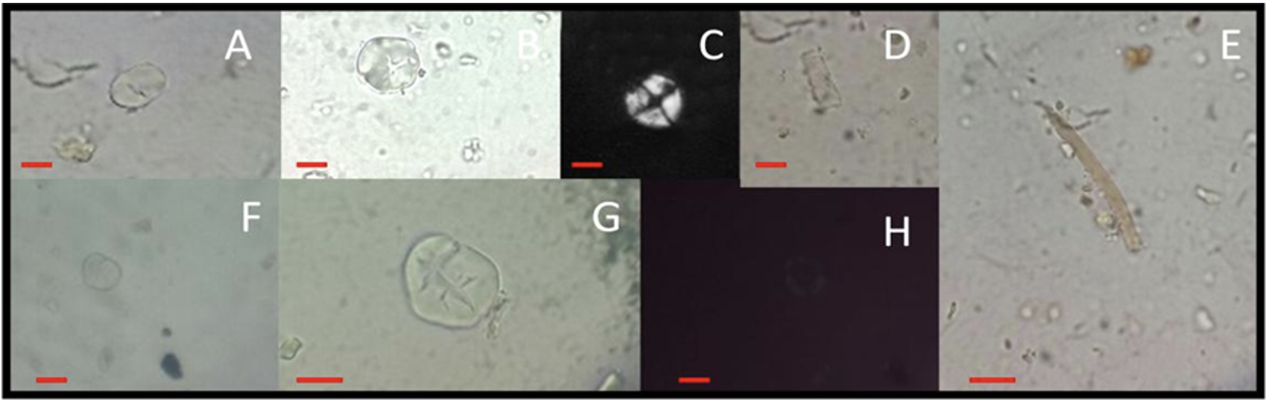 Imagen 5. Microrrestos presentes en la muestra 1 de Ribera 1. A. Grano de almidón indeterminado sin birrefringencia. B y C. Grano de almidón de Zea mays con luz normal y polarizada. D. Fitolito. E. Espícula de esponja. F, G y H. Grano de almidón de Phaseolus vulgaris con luz normal y polarizada. Escala 10 µm.