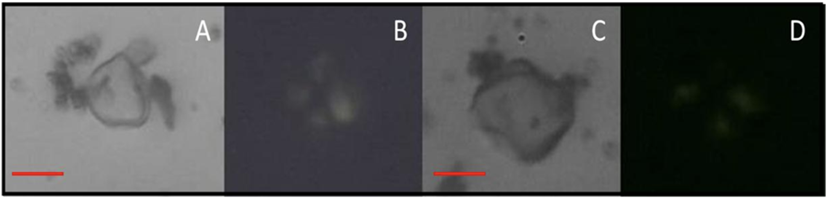 Imagen 6. Microrrestos presentes en la muestra 2 del sitio Ribera I. A y B. Grano de almidón de Zea mays. C. Tejido vegetal. D. Grano de almidón no identificado. Escala 20 µm.