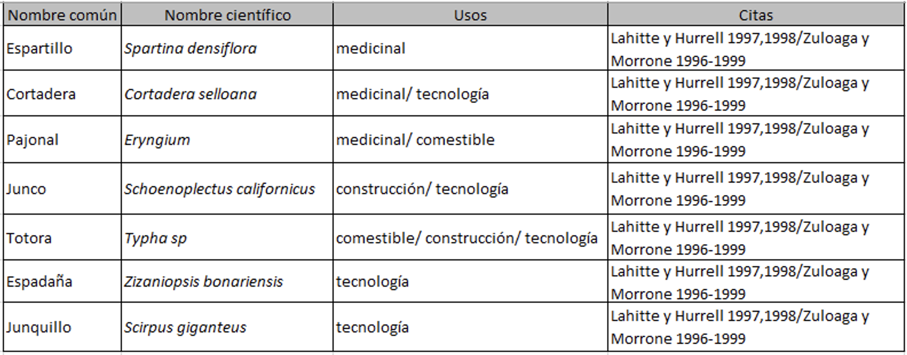 Durante el desarrollo de nuestro trabajo de investigación territorial se realizaron muestreos en los ambientes próximos al sitio arqueológico, ampliando la información acerca de la estructura de la vegetación existente para el área (Lahitte et al., 1999a, 1999b; Verboost, 1967). Se tomó en cuenta el nombre vulgar de las especies y sus usos actuales y/o históricos de acuerdo con la información bibliográfica y los pobladores del área. Los usos se clasificaron en medicinal, combustible, comestible, tecnológico (para la confección de artefactos) y construcción. Se recolectaron muestras de hojas, tallos, raíces, flores y frutos. Las especies relevadas en la siguiente tabla.